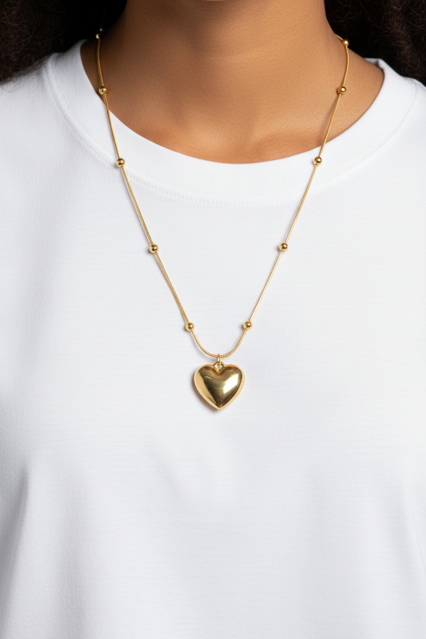 O Colar Coração Dourado Esferas é puro charme: corrente tipo rabo de rato com esferas polidas e pingente de coração chapado, tudo em dourado intenso. Uma joia moderna, delicada e cheia de presença para iluminar qualquer ocasião.