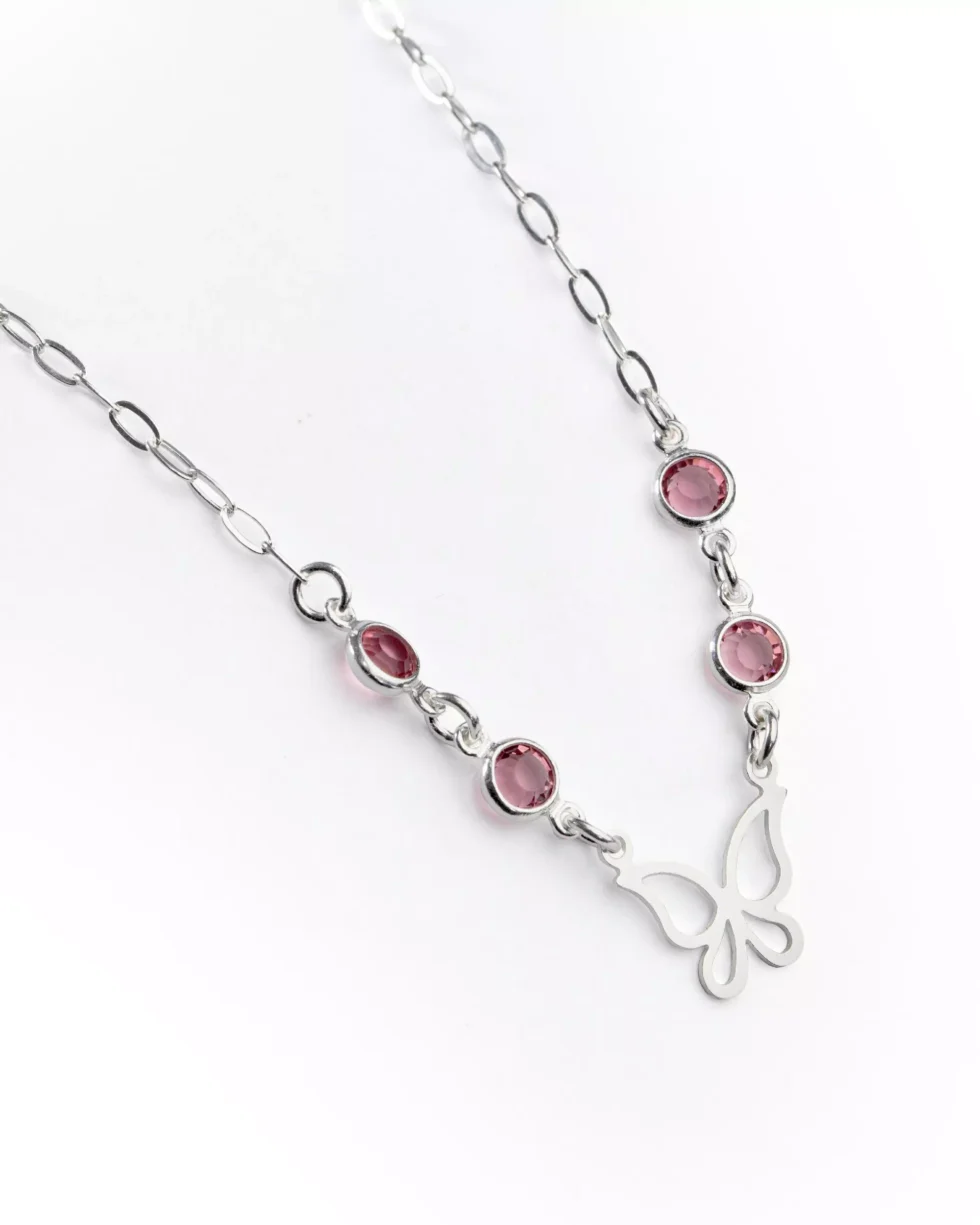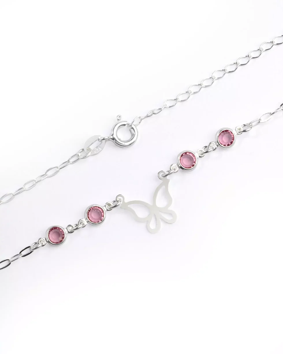 O Bracelete Aurora Borboleta combina leveza e sofisticação em uma peça única: corrente de prata com pingente de borboleta e pedras rosas reluzentes. Um acessório delicado, versátil e encantador que traz um toque de transformação e elegância a qualquer look.
