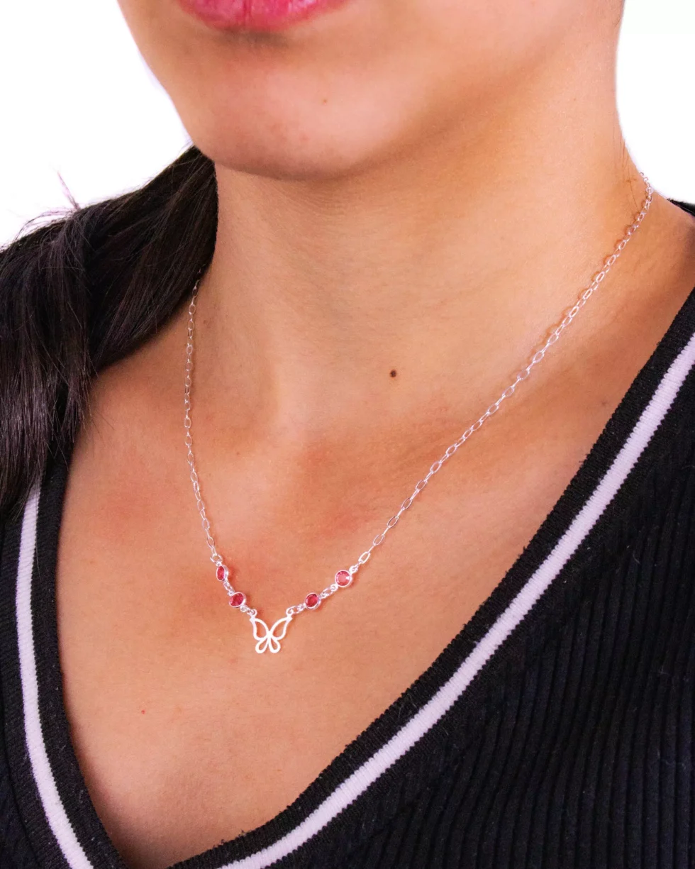- Pingente de borboleta com quatro pedras rosas que simbolizam renovação e amor