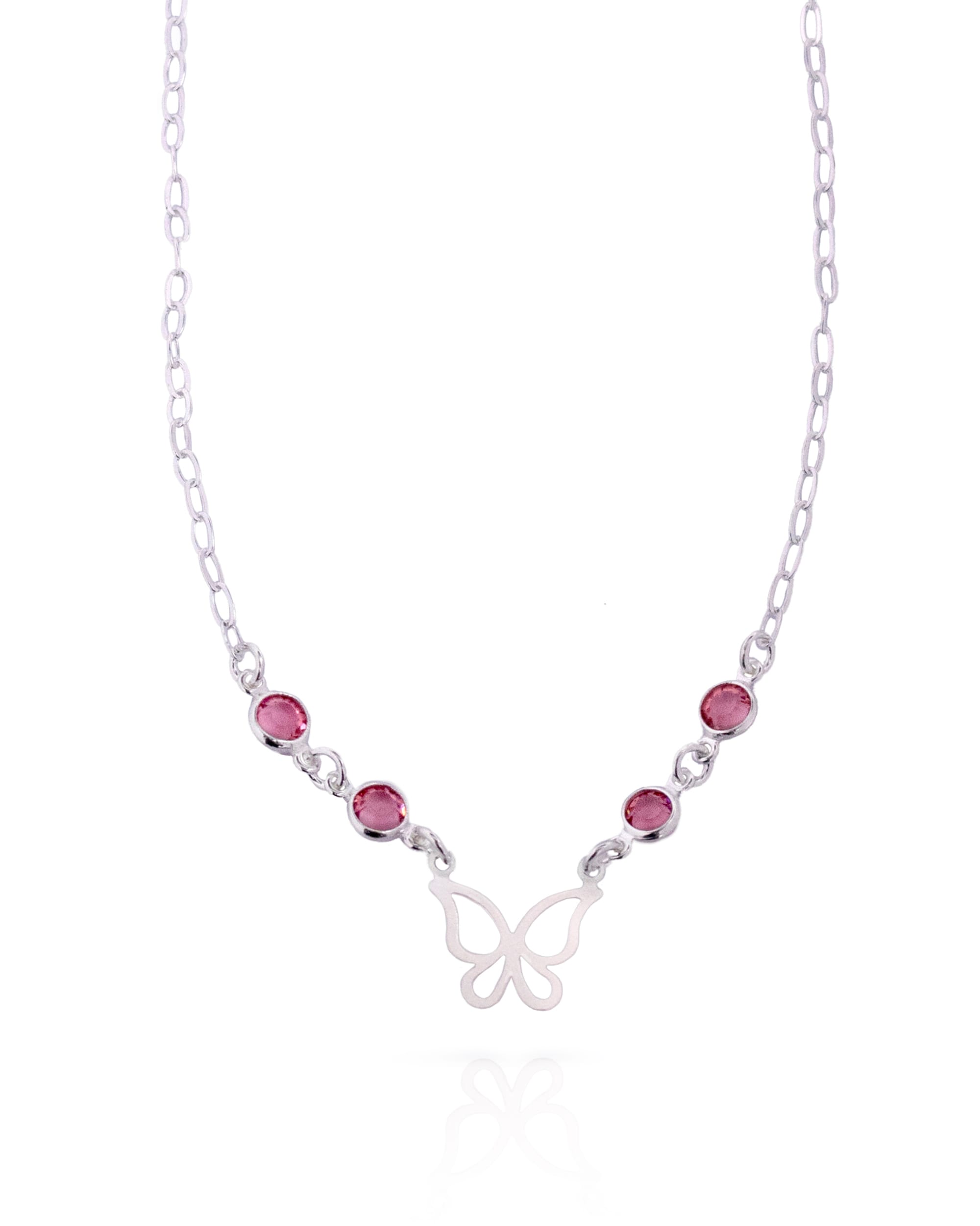 - Pingente de borboleta com quatro pedras rosas que simbolizam renovação e amor