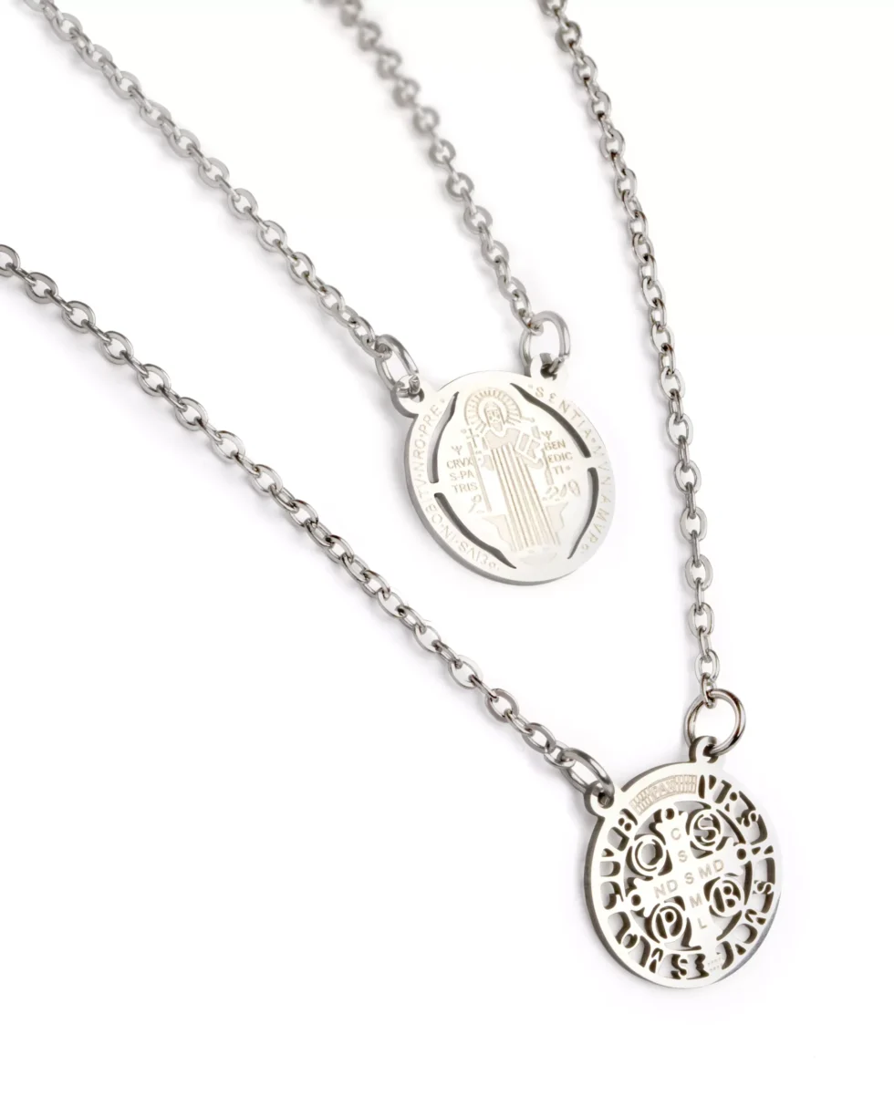 Características: Corrente de elos finos com duas medalhas redondas: uma com a imagem de São Bento e outra com a cruz e inscrições tradicionais. Detalhes em alto-relevo e acabamento espelhado para máximo brilho.