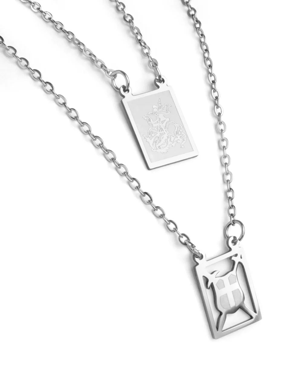 Características: Corrente de elos finos com duas medalhas retangulares: uma gravada com a imagem de São Jorge e outra com escudo vazado estilizado. Detalhes em alto-relevo e acabamento espelhado para máximo brilho.