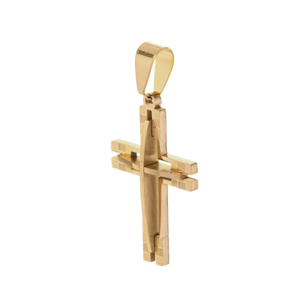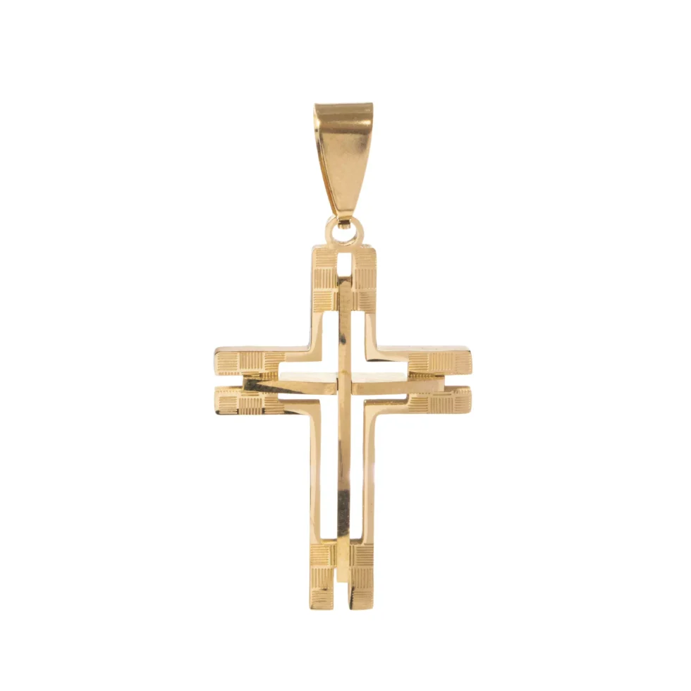 • Pingente de cruz 3D robusto, com entalhes riscadinhos e acabamento facetado