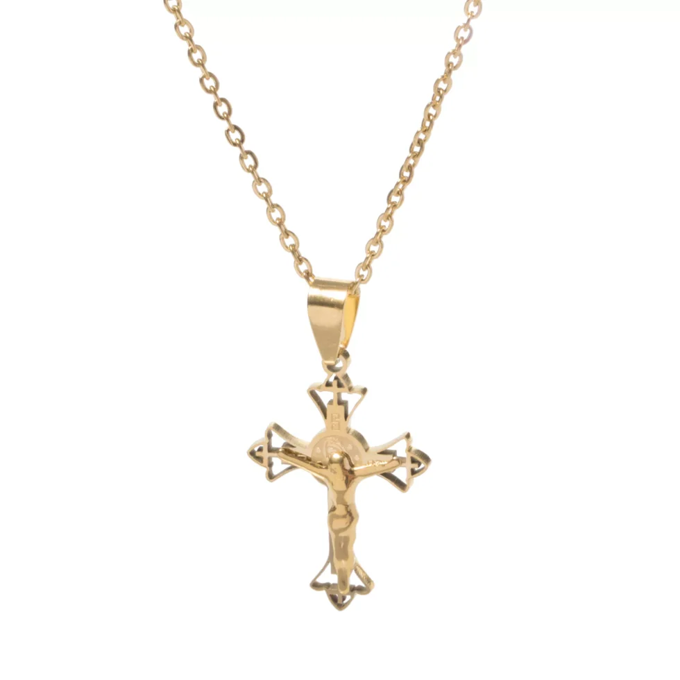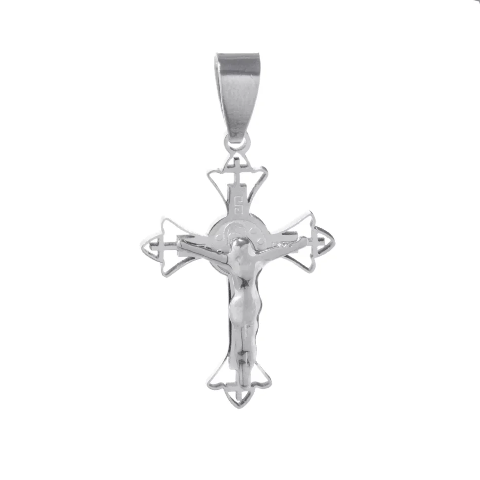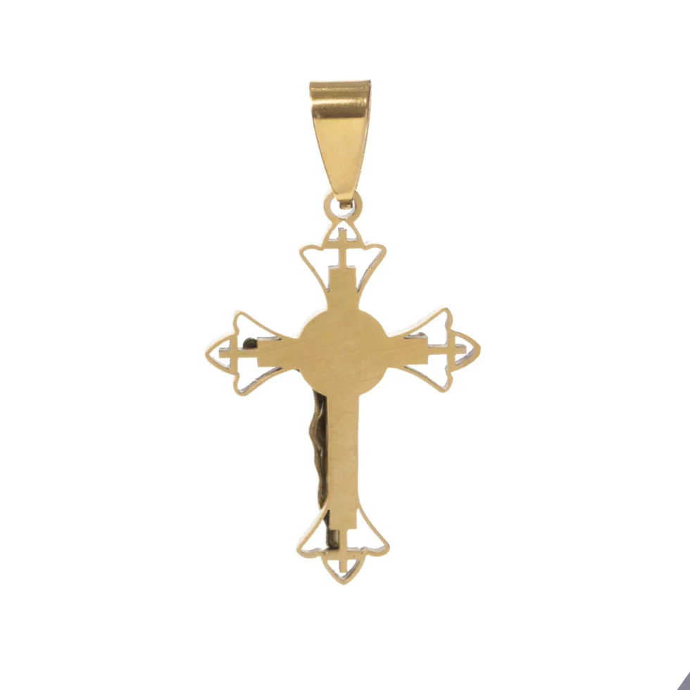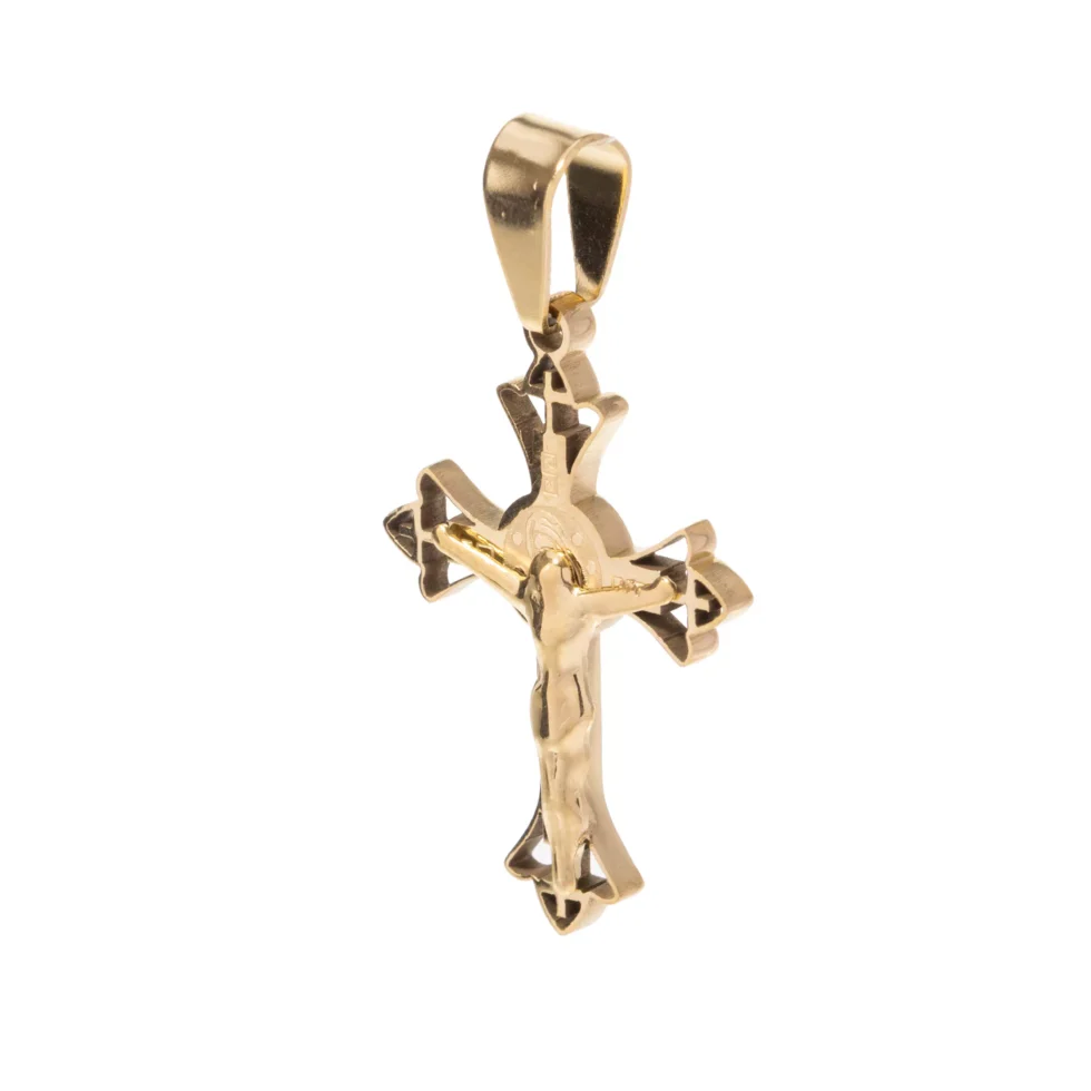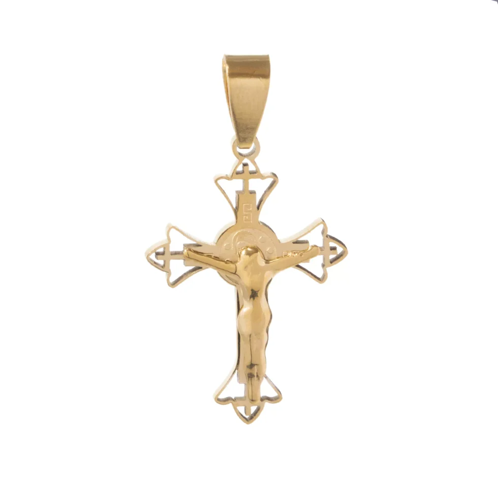 Pingente de cruz tridimensional com recortes vazados e detalhes artísticos